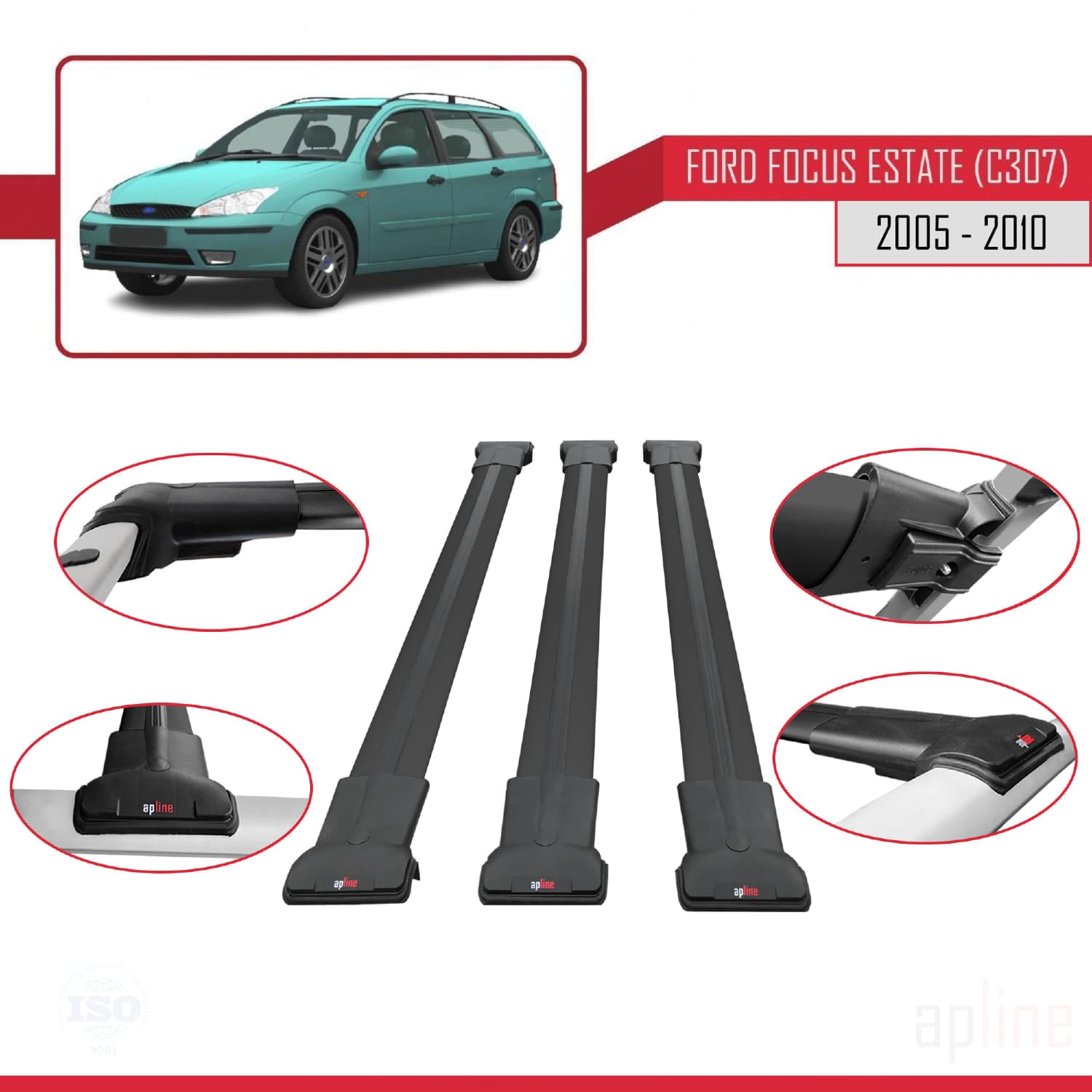 Compatible avec Ford Focus 2 (C307) Break 2005-2010 FLY Model Barres de Toit Railing Porte-Bagages de Voiture Noir Aluminium 3 Barres