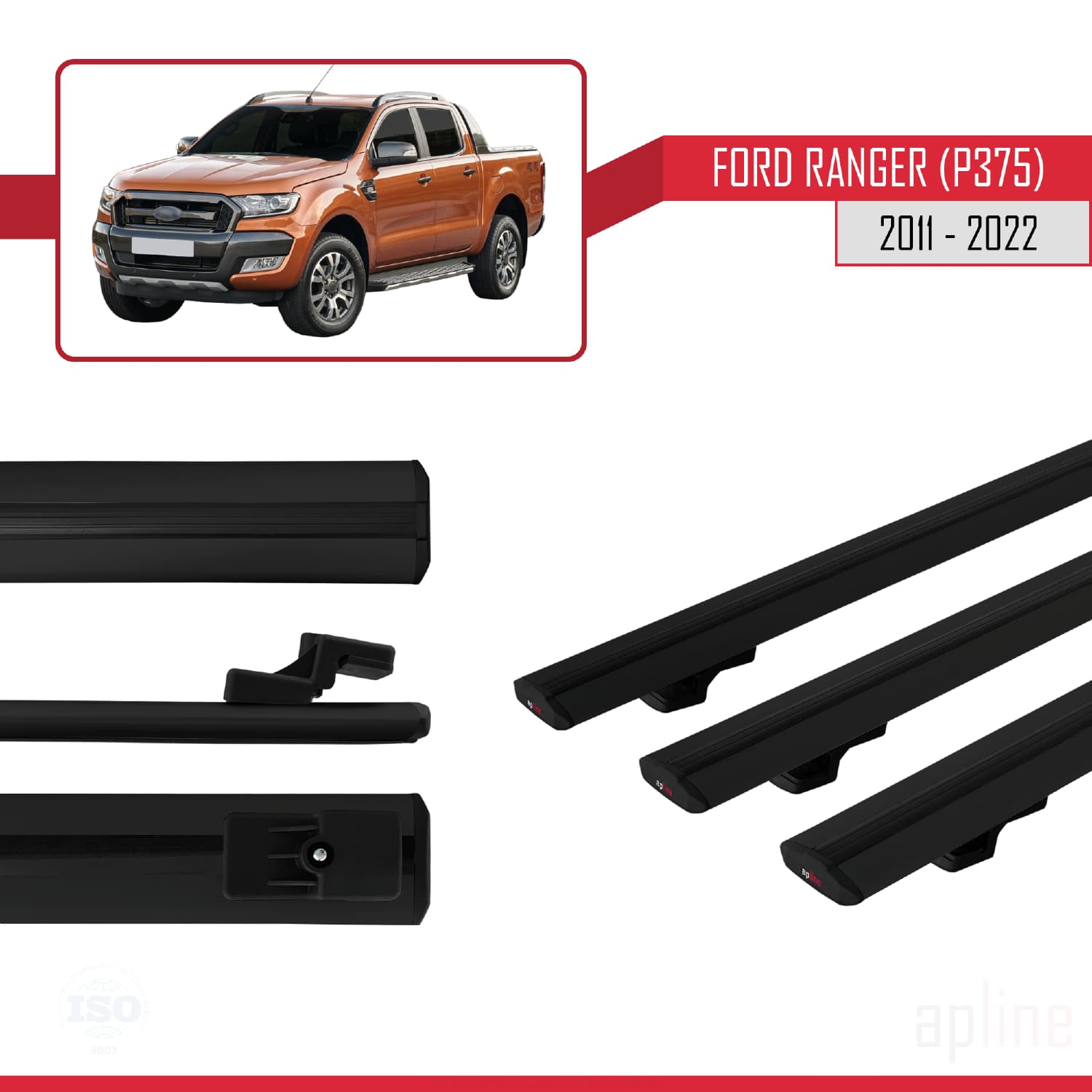 Compatible avec Ford Ranger (P375) 2011-2022 BASIC Model Barres de Toit Railing Porte-Bagages de Voiture Noir Aluminium 3 Barres