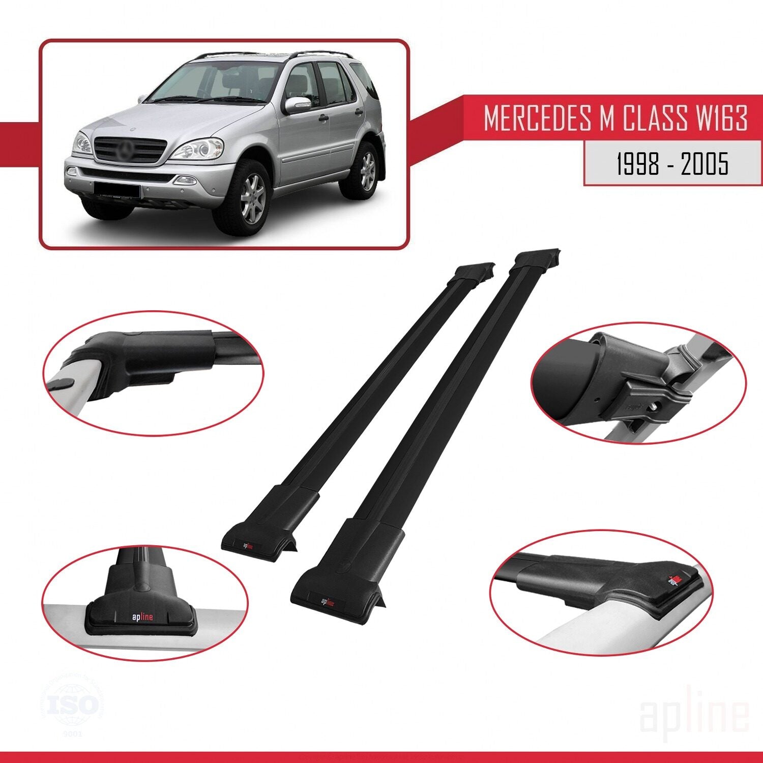 Compatible avec Mercedes Classe M (W163) 1998-2005 FLY Model Barres de Toit Railing Porte-Bagages de Voiture Noir Aluminium 2 Barres