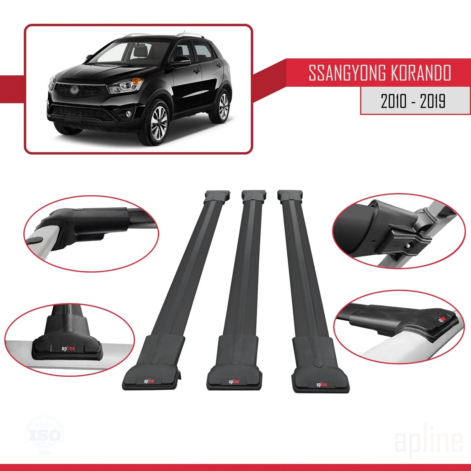 Compatible avec Ssangyong Korando 3 (C200) 2010-2019 FLY Model Barres de Toit Railing Porte-Bagages de Voiture Noir Aluminium 3 Barres