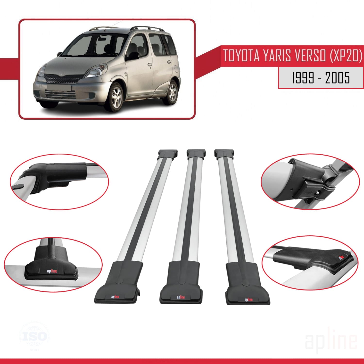 Compatible avec Toyota Yaris Verso (XP20) 1999-2005 FLY Model Barres de Toit Railing Porte-Bagages de Voiture Gris Aluminium 3 Barres